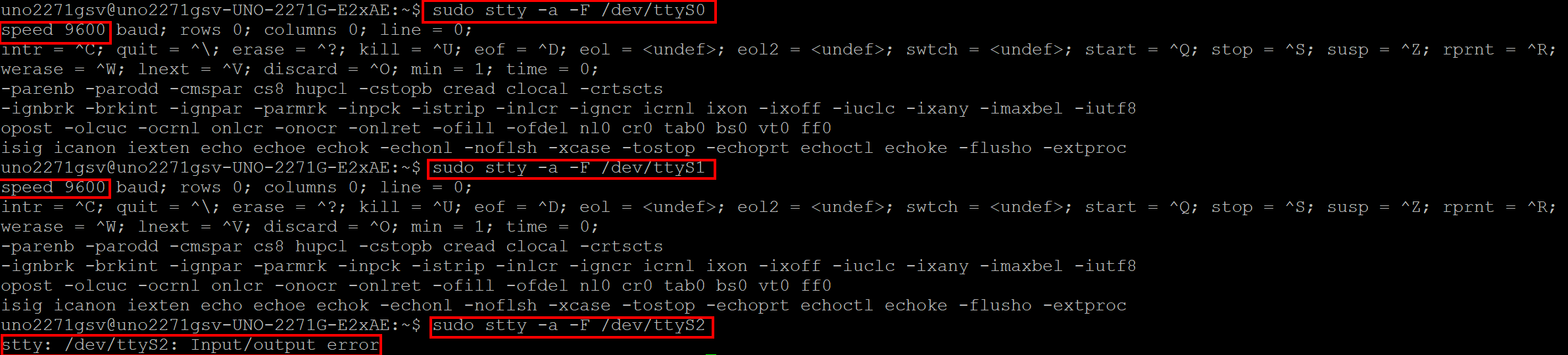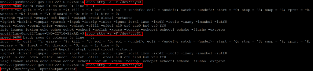 sudo stty -a -F /dev/ttyS0 sudo stty -a -F /dev/ttyS1 sudo stty -a -F /dev/ttyS2