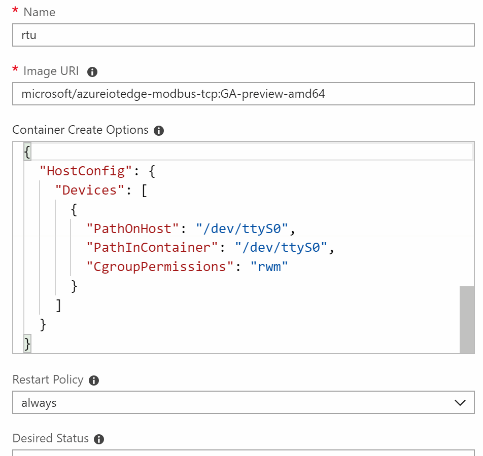 Note: At this moment, Modbus RTU is only supported in IoT Edge running on Linux (with Linux containers). That’s the limit of Windows 10 and Docker, not about Iot Edge or the Modbus module!