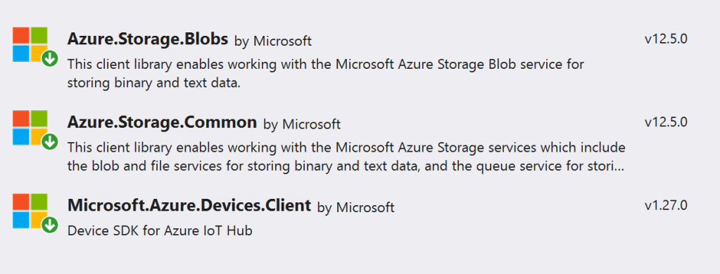 Note: The Microsoft.Azure.Devices.Client should be enough to start communicating with the cloud. The other two are just needed for sending files over to the cloud. You can skip these two if not needed.