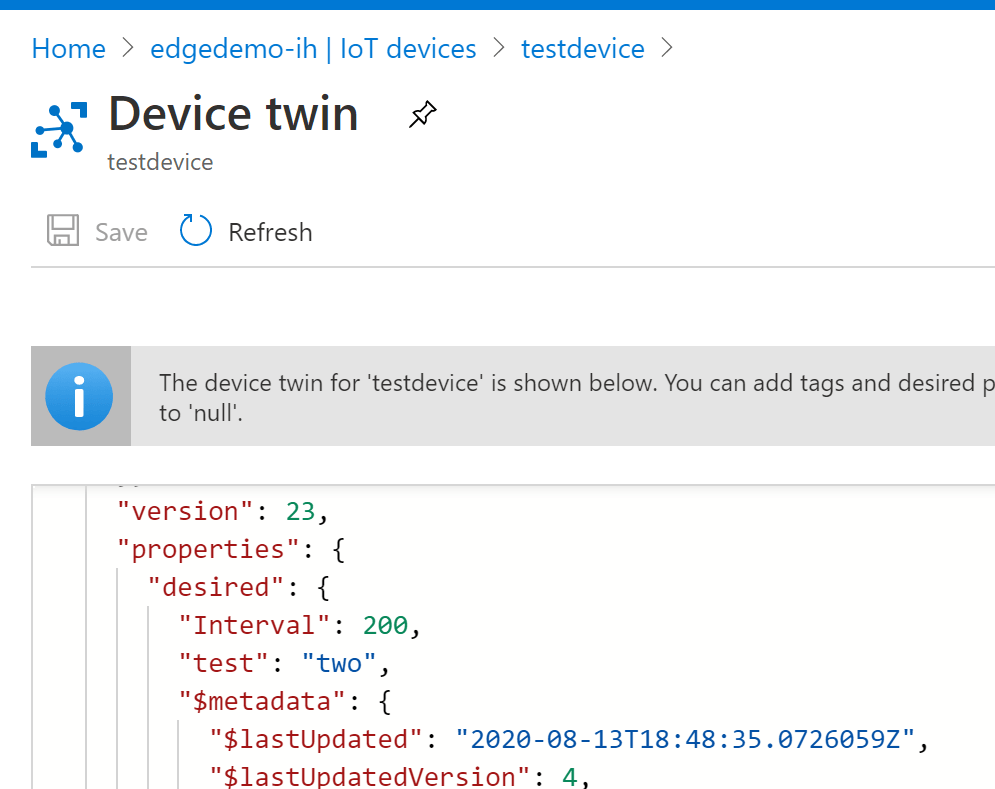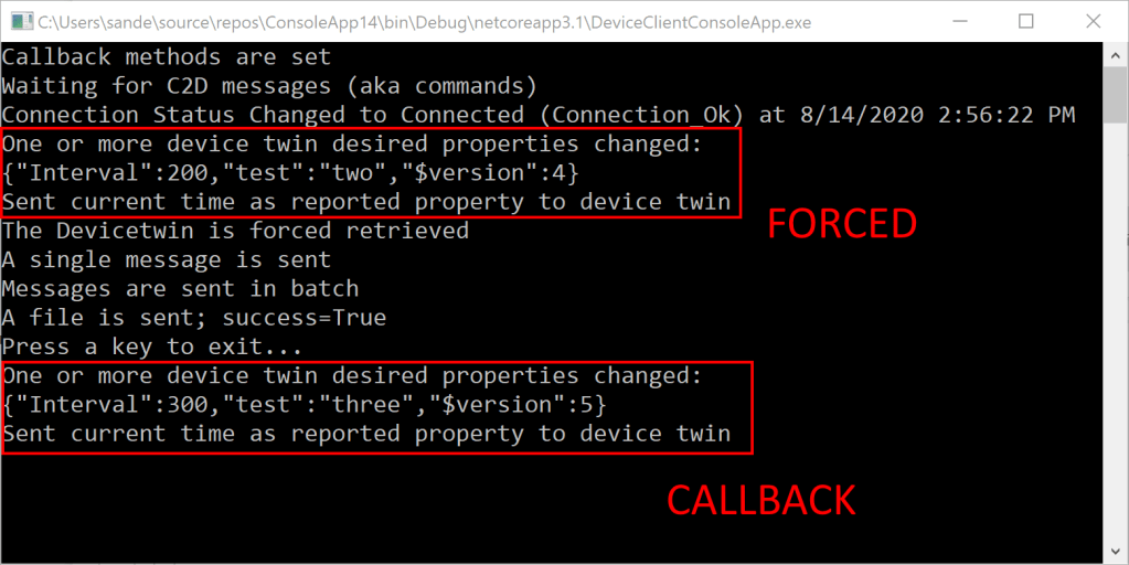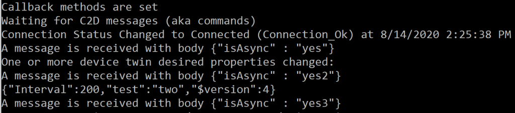 As seen during the setup of the callback function, we can detect changes to the device twin desired properties.