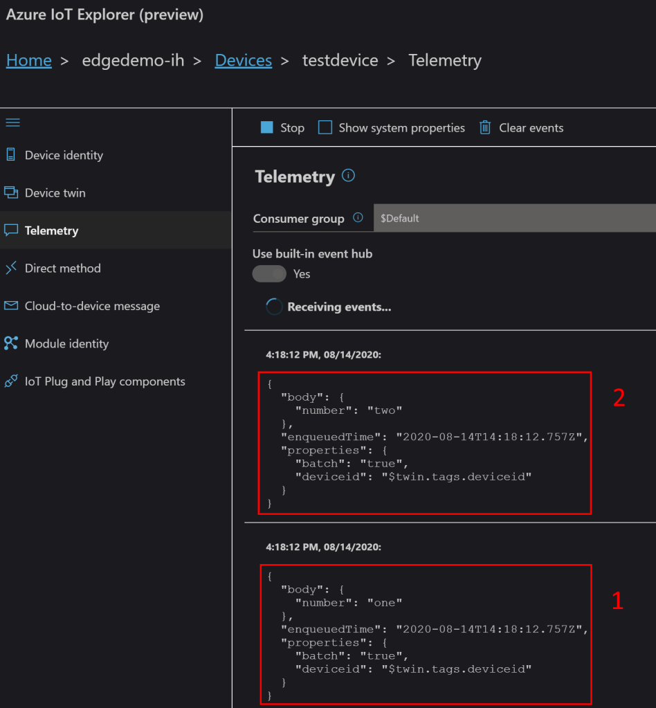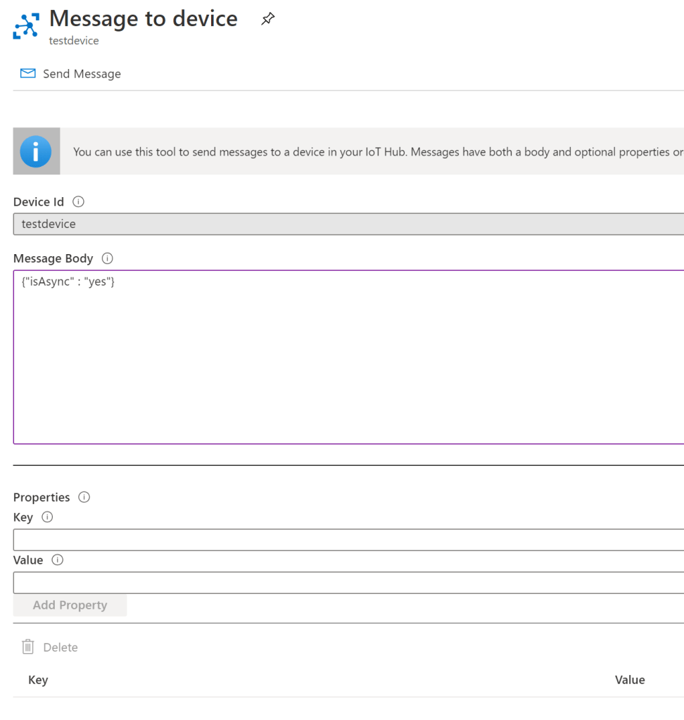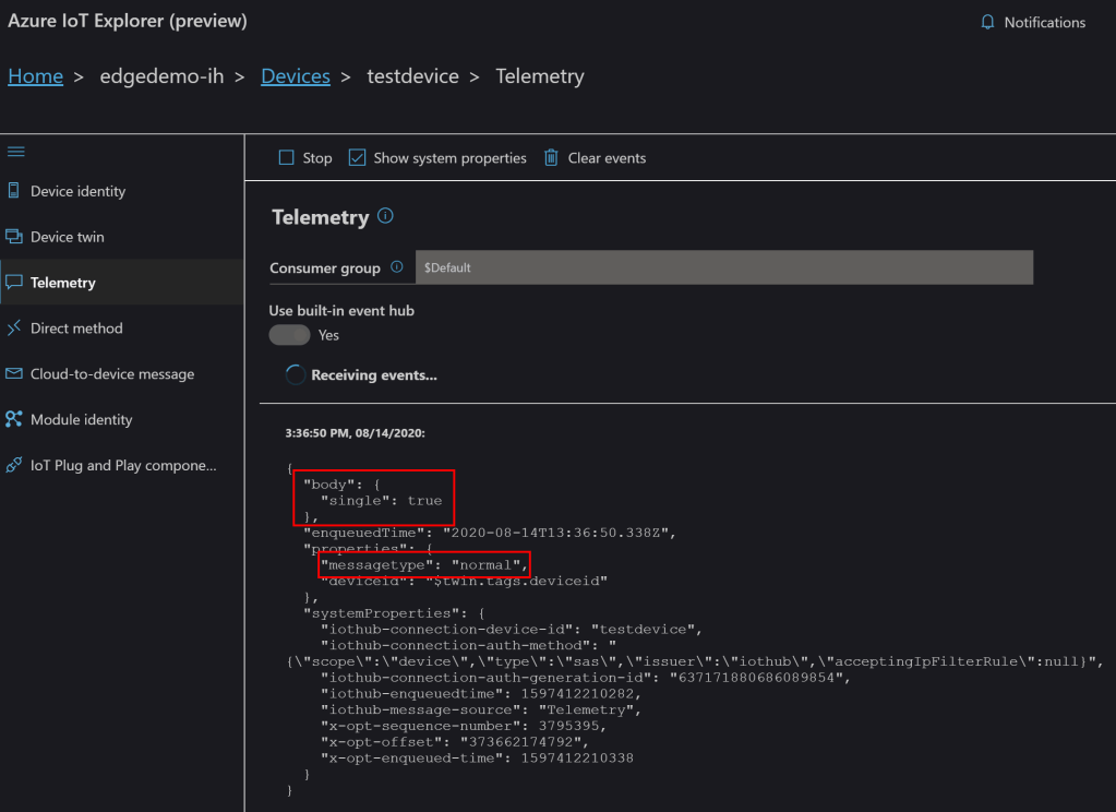 I added an application property named ‘messagetype’. As you can see, the IoT Hub adds multiple system properties also.