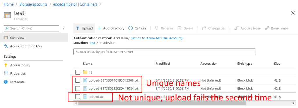 So I also tried to upload the same file name ‘upload.txt’ multiple times. This only works one time, the second time the upload fails:
