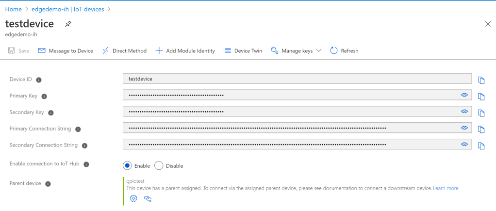 As you can see, each device has its own security keys. Here I use symmetric keys for this demonstration.