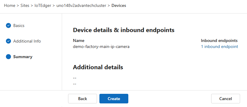 On the last page, a summary is shown with device details and the inbound endpoint we added: