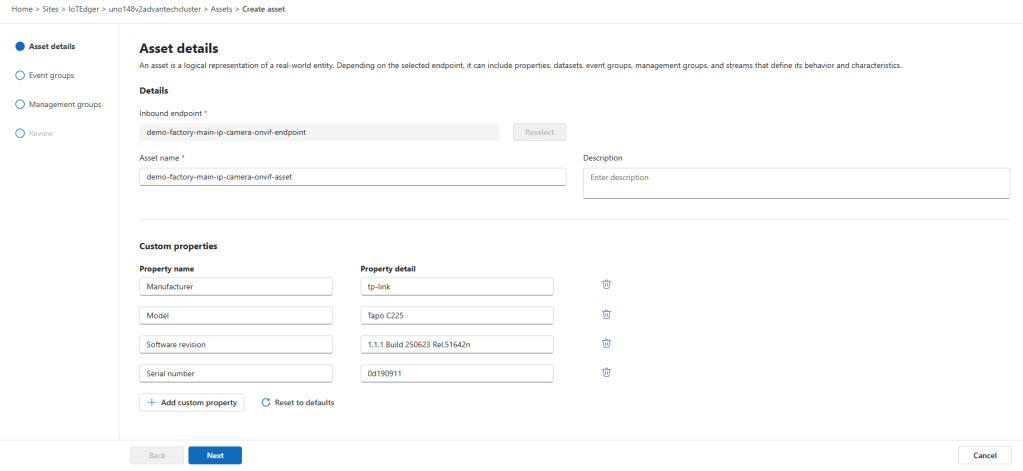 Give the asset a proper name like ‘demo-factory-main-ip-camera-onvif-asset’.