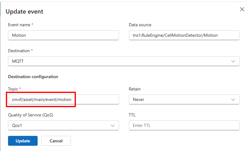 Set the MQTT destination topic to ‘onvif/asset/main/event/motion’ (as a suggestion; you can define your own special topic):
