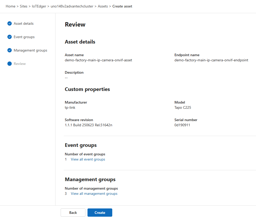 Finally, review the summary and create the asset: