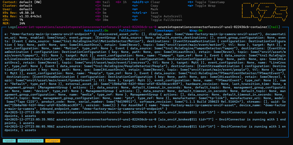 Using K9S, we can see an ‘azureiotoperationsconnectorforonvif’ pod is running on our edge device: