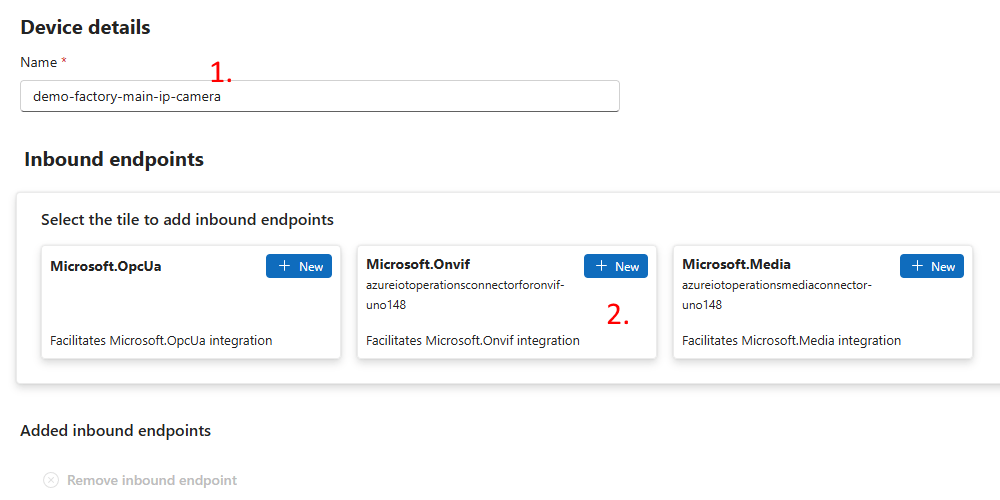First, in this step, we provide a proper name (1), and then we will add the ONVIF endpoint details via the ONVIF selection (2) :