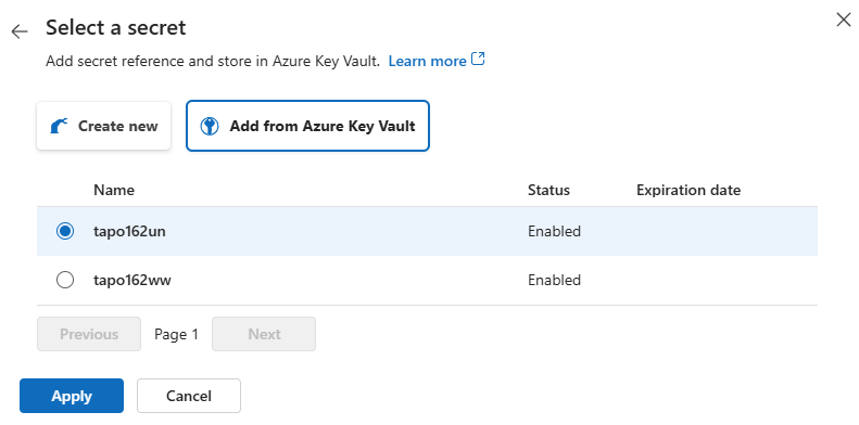 Here, I show how to add the name and password via the key vault because these were added in the past already: