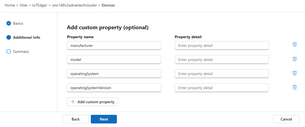 On the next page, optional custom properties can be added: