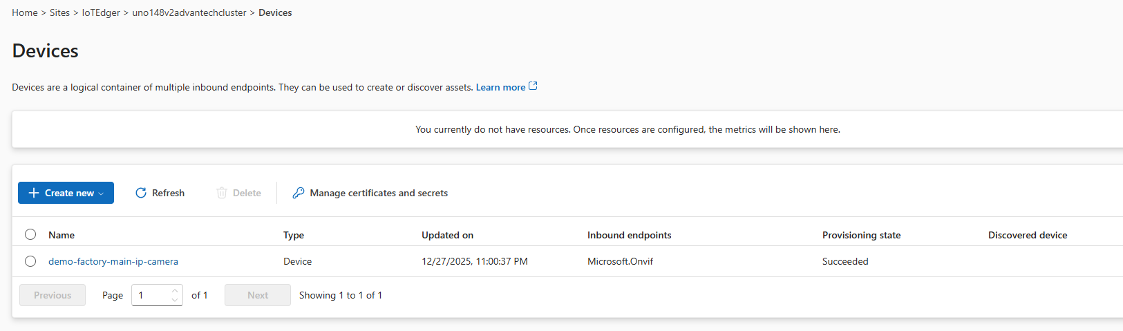 So, we have created an IP camera device with an ONVIF endpoint on the Azure IoT Operations edge device via the IoT Operations experience.