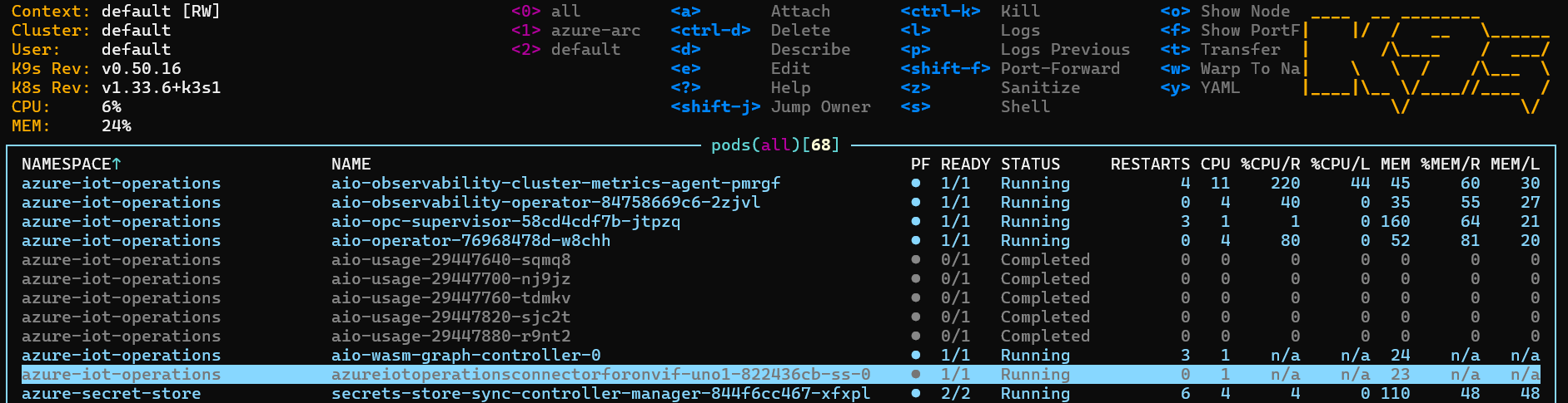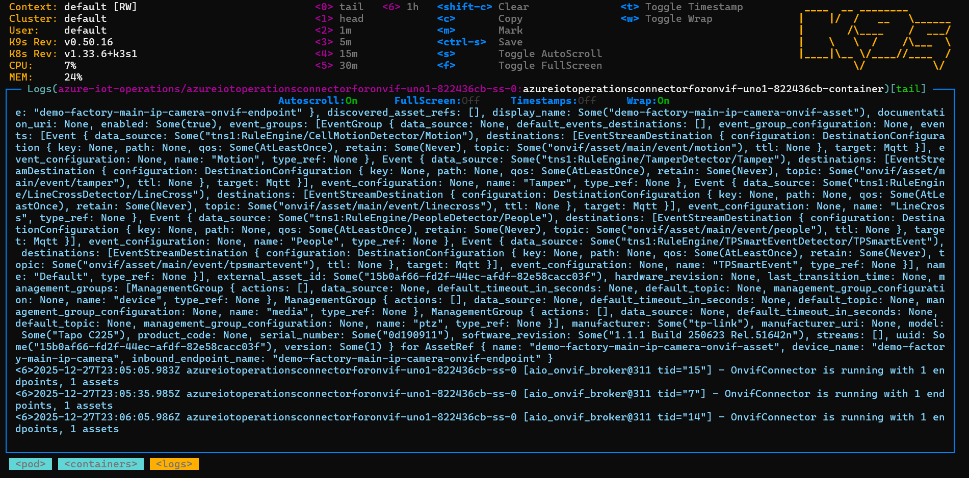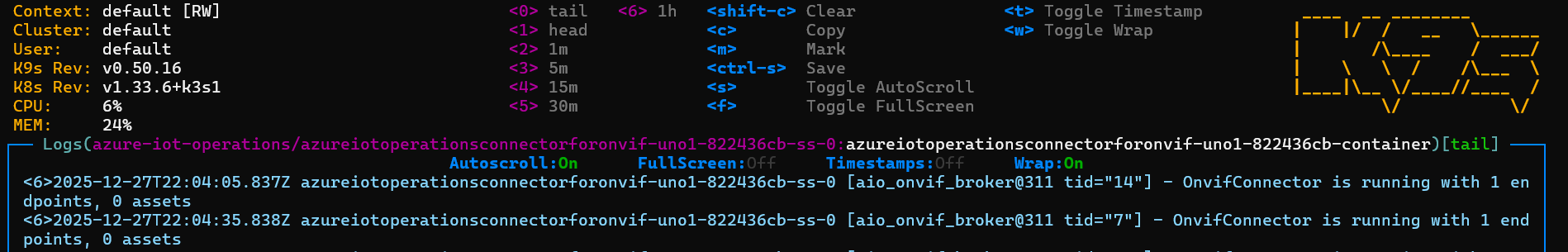 Using K9S, we can see an ‘azureiotoperationsconnectorforonvif’ pod is running on our edge device: