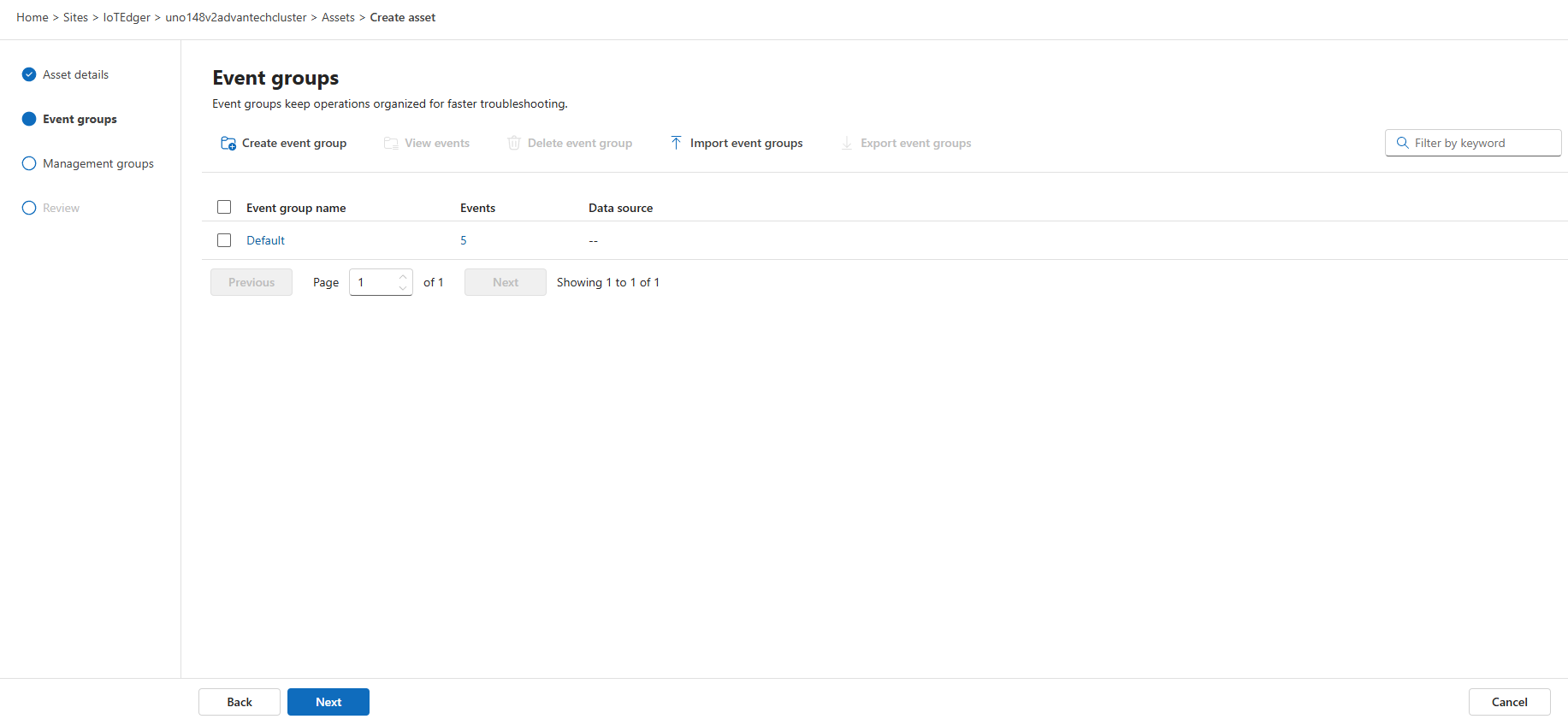 On the next page, a default event group is shown having five event(names):