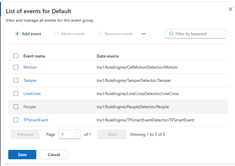 We do not need to add a separate event group to access the IP camera standard events as seen at the top of this post. The default event group covers them all.