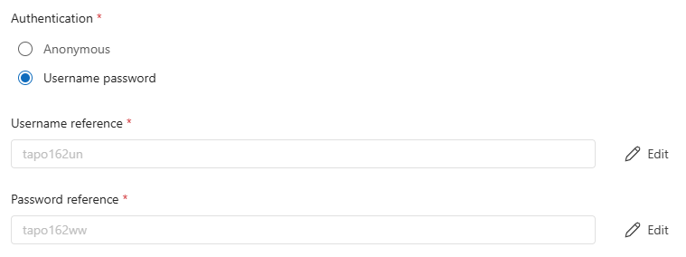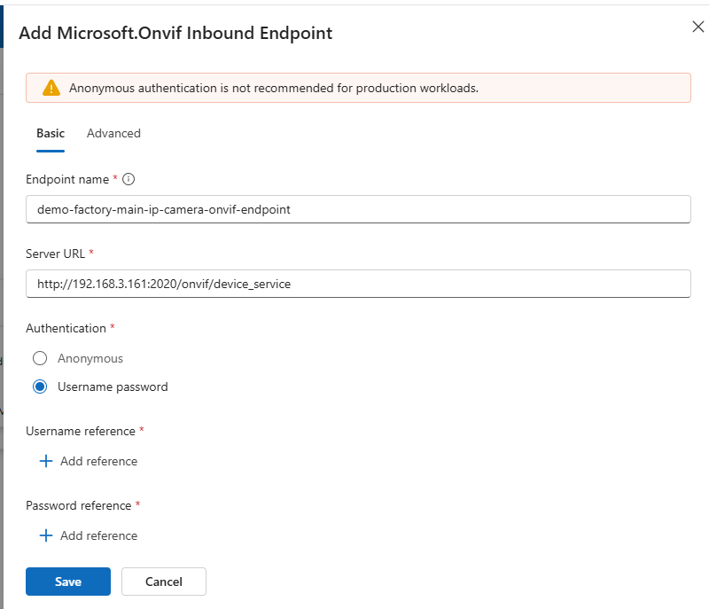 Notice that I added the camera account, needed as authentication for this ONVIF endpoint (as it works for RTSP too). Use both ‘Add reference’ buttons to add the name and password.